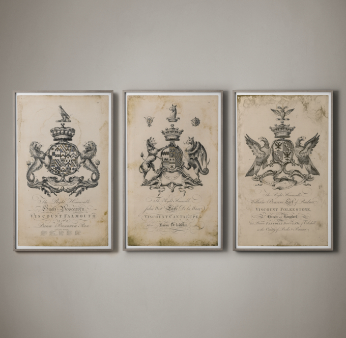 for "Restoration Hardware Carmel Collection / 18th C. English Armorial Large Engraving Collection / Restoration hardware is doing interesting things these days."